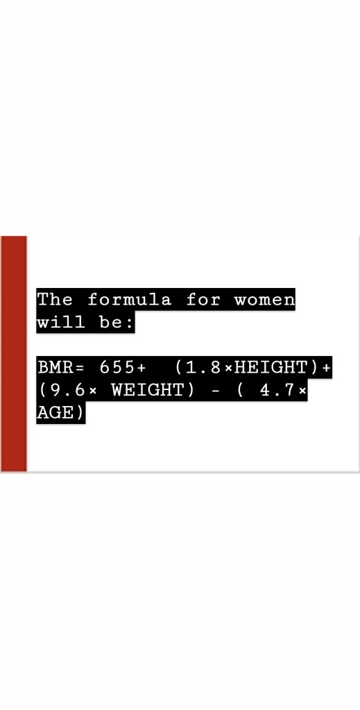 BMR= 655+ (1.8×HEIGHT)+ (9.6× WEIGHT) – ( 4.7× AGE)